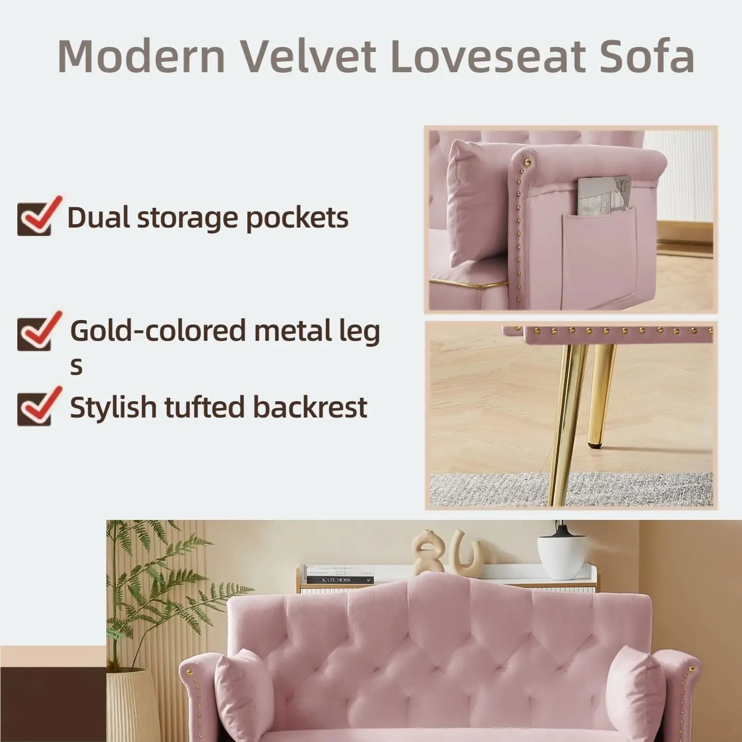 Sturdy construction:The solid wood frame and sturdy metal legs provide a durable frame for a modern sofa without the fear of cracking, and the simple construction makes it super easy to assemble. The plated legs and leather trim will retain their golden luster for a long time without problems such as paint chipping or fading. In addition, the non-slip pads protect the floor from scratches.